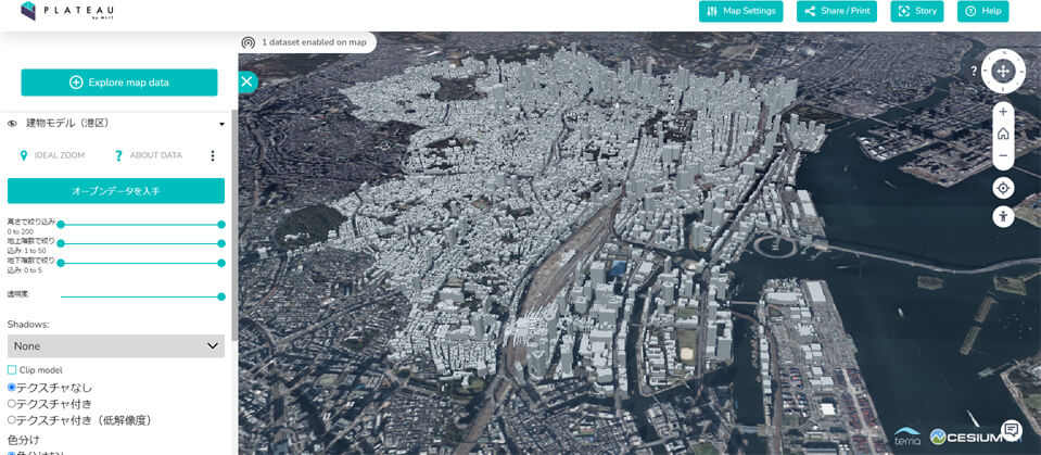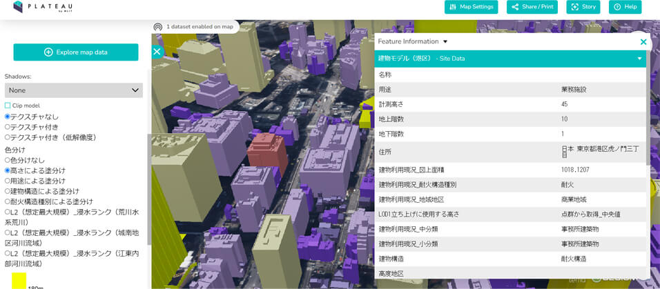 左側にある「Explore map data」から、表示するデータを選びます。今回は「建物モデル (港区)」を選択します(港区には、Kvizを運営する株式会社Tooがあることからです、皆さんの好きなエリアをお選びください)。